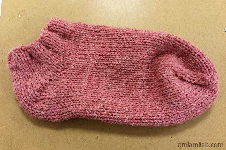 急遽編む事になったのと、目が見やすいように明るい色の太い糸で編んだので、厚手の靴下になってしまいました💦